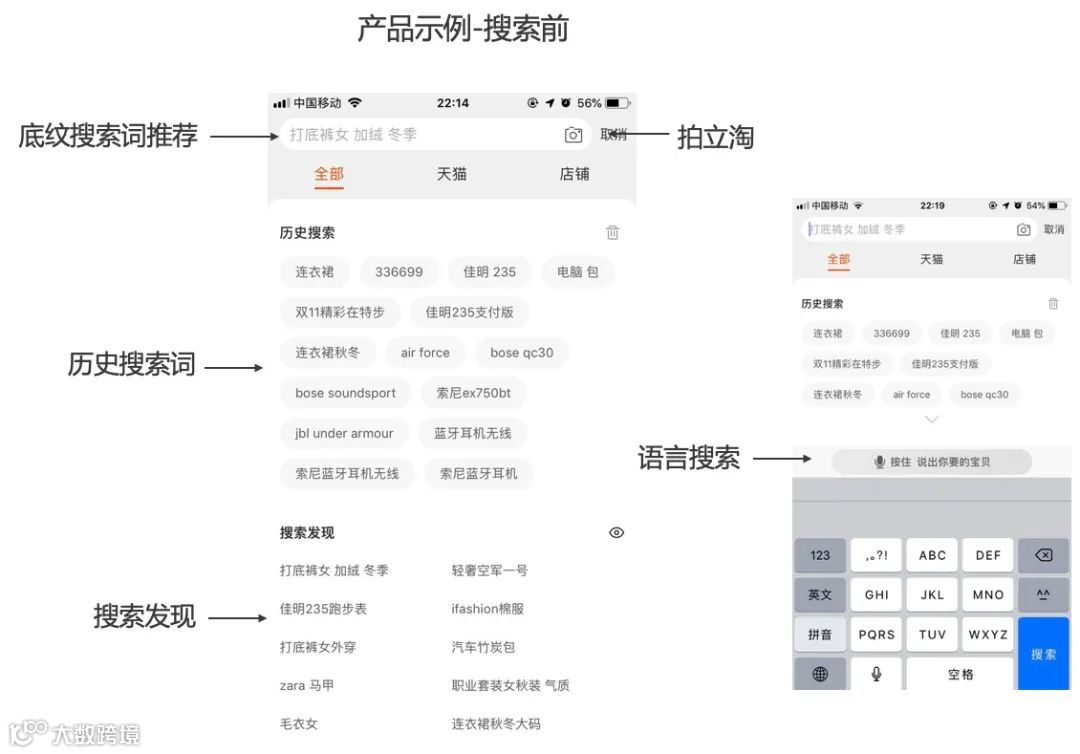 典型产品:搜索底纹、搜索发现 、历史搜索词、热门搜索词
