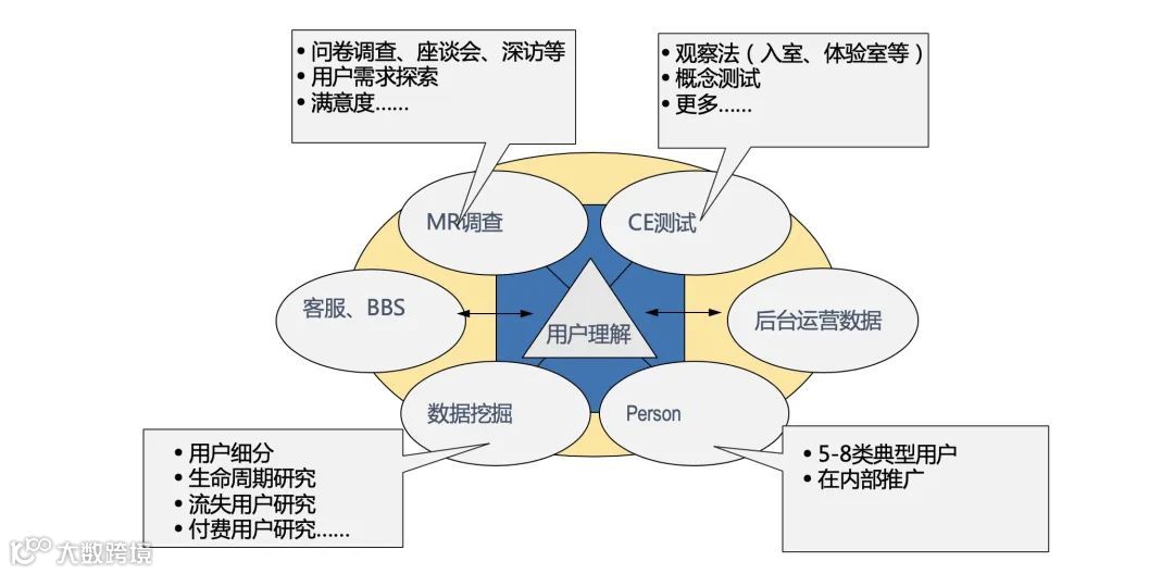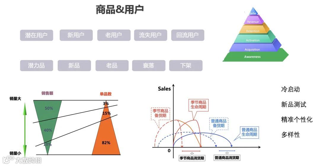通过用户静态数据结合海量的平台用户行为数据的方式,通过埋点,我们可以看到用户在我们平台上看了什么商品,点了什么商品买了什么商品,将这些数据串起来,可以作为入口去理解用户,更进一步,通过统计、概率、知识进行建模,比如说:用户细分、生命周期划分、流失用户研究等,做深层次的挖掘。