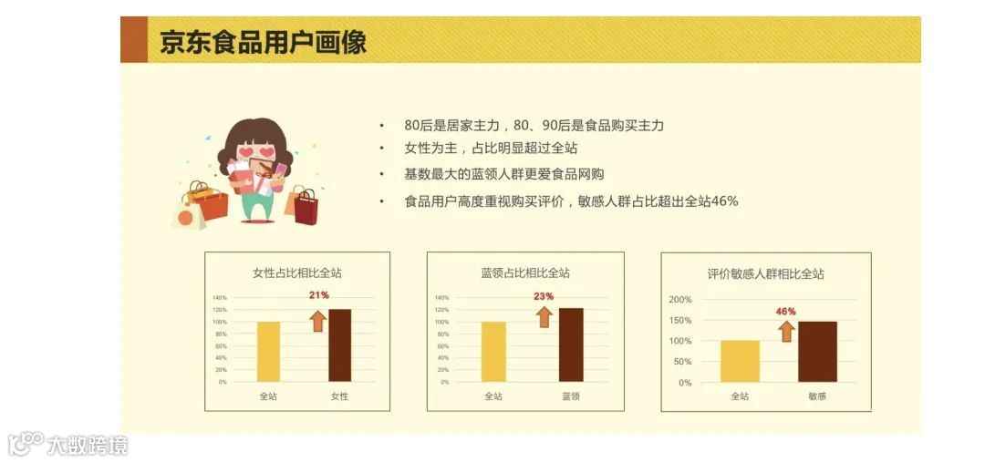 当然较常见的用户画像是我们需要建立平台客户群体化认知时,需要借助可视化的标签,比如京东的一个食品用户画像,对于食品这个业务场景,平台上购买的用户他们是长成什么样的?比如性别比例,蓝领与白领占比,评价敏感的人的占比等,通过拉平垂类偏好用户画像与全站的对比,来寻找差异点和优化点。