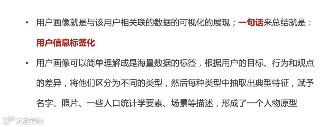 根据百科的定义,用户画像指的是与该用户相关联的数据的可视化的展现,然后一句话来总结的话就是用户信息标签化;从用户海量的信息里面去找到一些标签,为用户去贴上这些标签,而这些标签的来源就是用户的行为。
