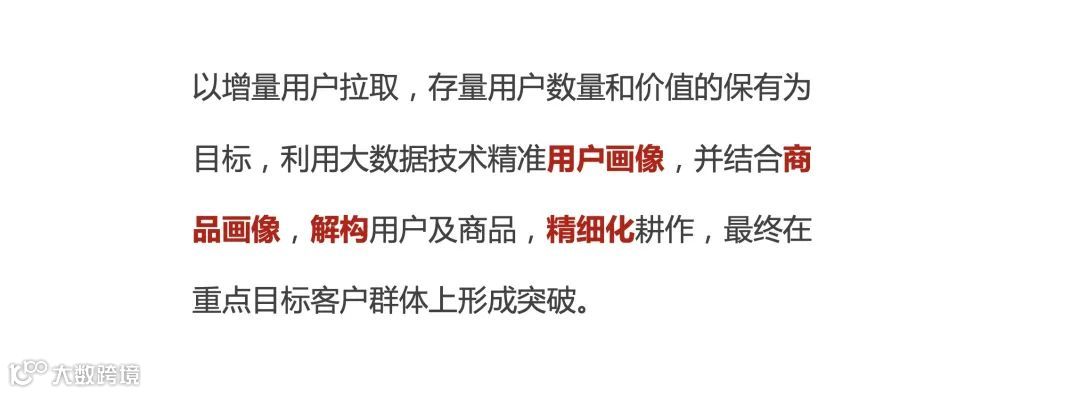 以增量用户拉取,存量用户数量和价值的保有为目标,利用大数据技术精准用户画像,并结合商品画像,解构用户及商品,最终在重点目标客户群体上形成突破。