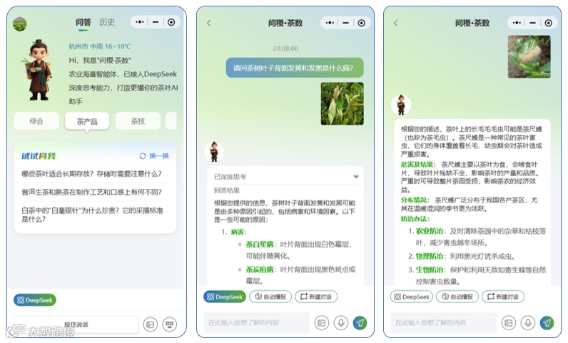 该智能体深度融合研究所在茶业育种、栽培、植保、加工、品质、经济等领域近十年的文献及丰富的数据和知识积累,依托托普云农领先的大模型技术,重点实现了种植加工数据分析及展示、茶文化及种植多模态智能问答、茶园动态监测与决策等核心功能,为茶产业与科研提供全链条智能化服务。