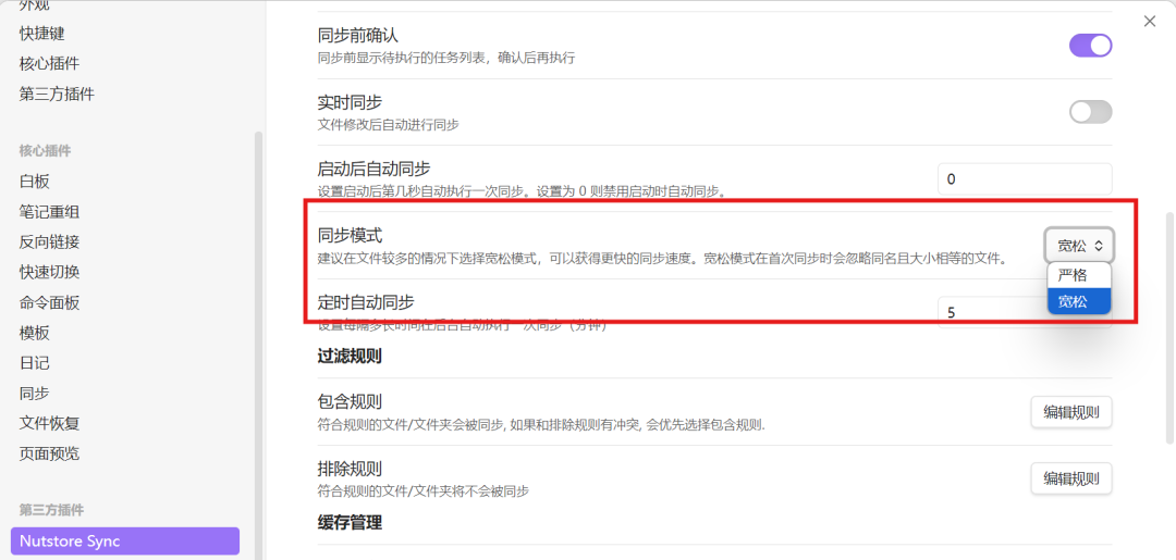 核心思路:打开宽松模式,如果本地的文件名和文件大小与远程的一样,就不会上传或者下载文件,所以在首次同步之前,先把所有的笔记手动复制到 Obsidian 的仓库文件夹里,后续就算有10000个文件,也不会发送10000个请求,就不会被限流。