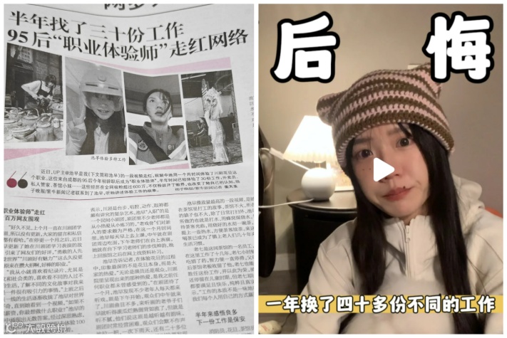 一年后,@池早是我发布视频《一年换了四十份工作,我和世界的连接却不止前进四十步》,该视频获得百万观看量,并迅速登上B站热门。而“我后悔辞职体验一百种工作了”的话题也在小红书发酵,热度值超过千万。