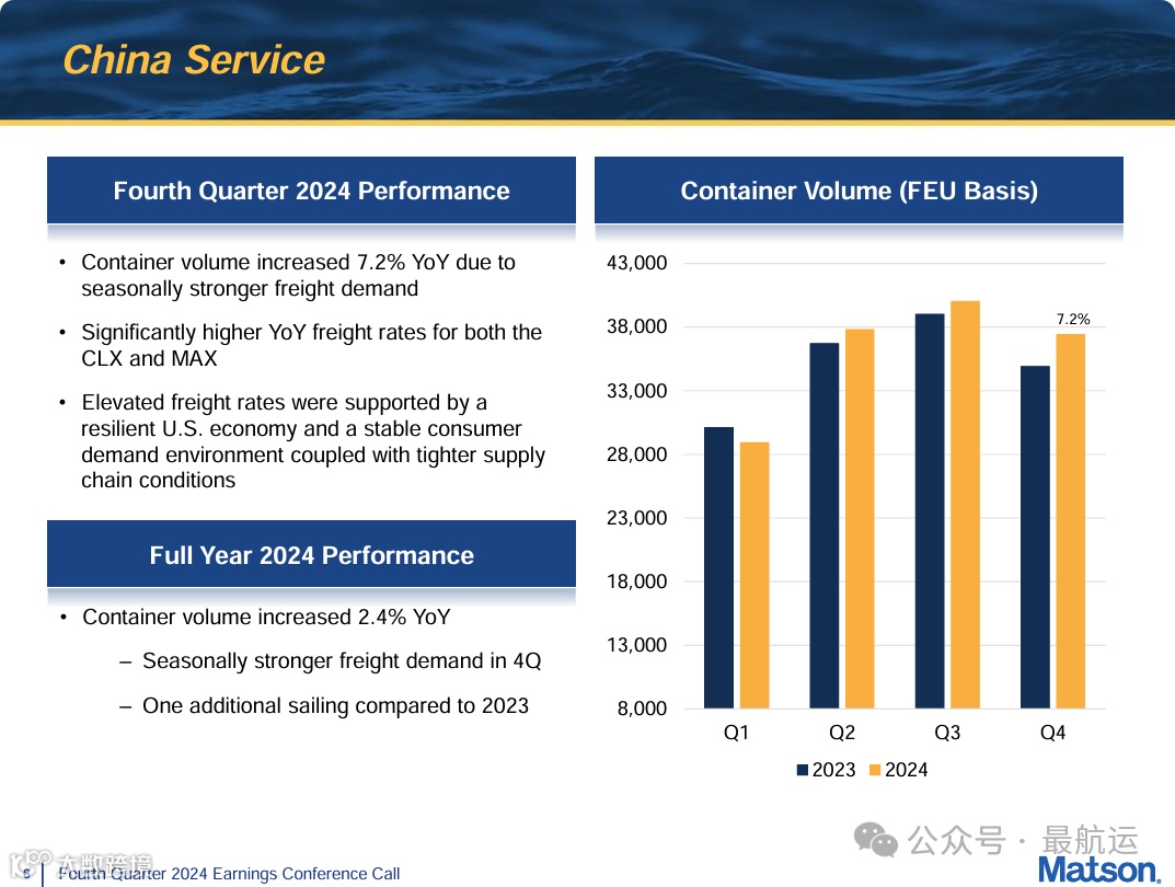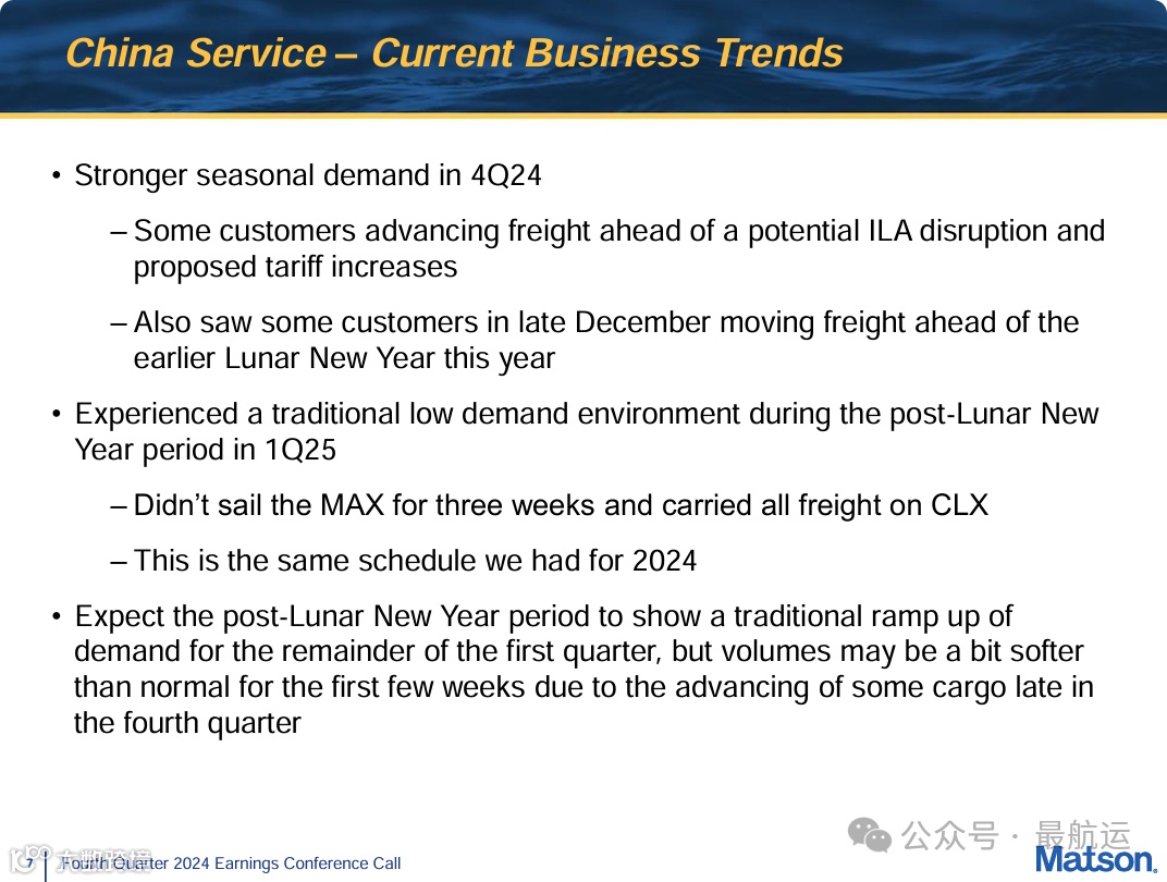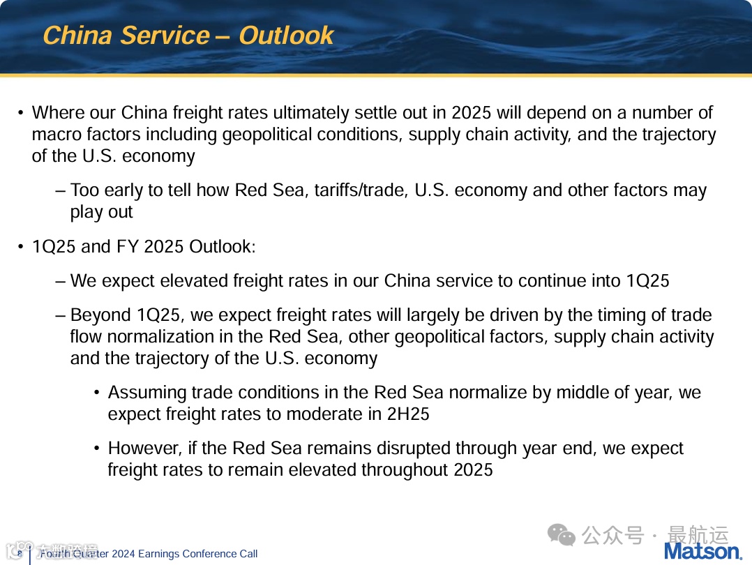 美森CEO Matthew Cox和CFO Joel Wine在财报问答环节中指出,2025年第一季度的综合营业利润预计将显著超越去年同期水平。主要驱动力来自运费上涨以及中国服务(美线)的高货运价格持续至第一季度。