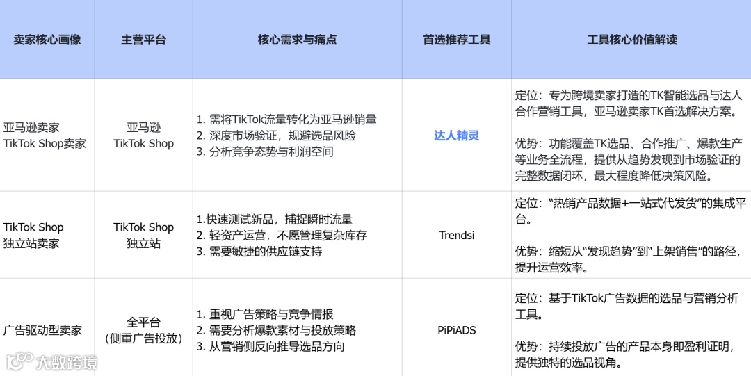 亚马逊/TikTok Shop卖家 → 首选达人精灵,洞察热门趋势、深度验证市场,拒绝盲目跟风;
