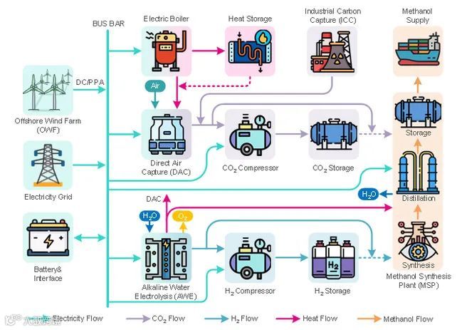 面对国际海事组织及欧盟日益严格的航运减排目标,绿色甲醇因其技术成熟、基础设施兼容性好,被视为重要的脱碳路径[k]。然而,高生产成本长期制约其大规模应用[k]。为突破瓶颈,研究团队提出“海上风电驱动绿色甲醇原位生产与加注”系统,集成海上风电、电解水制氢、碳捕集与甲醇合成装置,实现从风电到燃料的“一站式”供应,避免运输成本与额外排放,满足欧盟对可再生燃料全生命周期减排不低于70%的要求[k]。