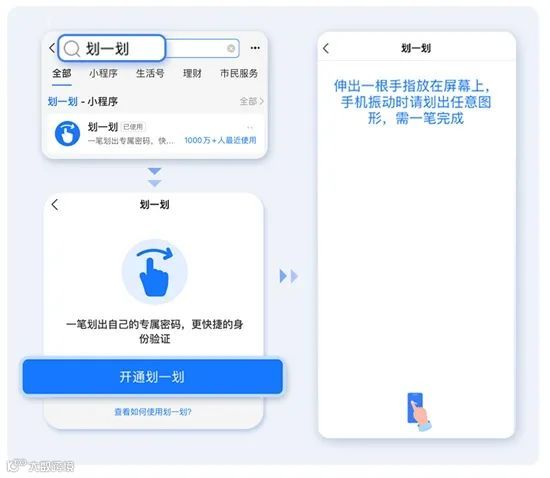 用户可以在支付宝 App 中搜索“划一划”开通,在屏幕上用手指划出任意图形来创建密码,之后在付款环节,只需要划出相同的图形,即可付款。