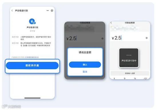 在“免密支付/自动扣款”中开通,开通后在付款时用语音说出付款金额,同时以声纹作身份校验,可快速支付。