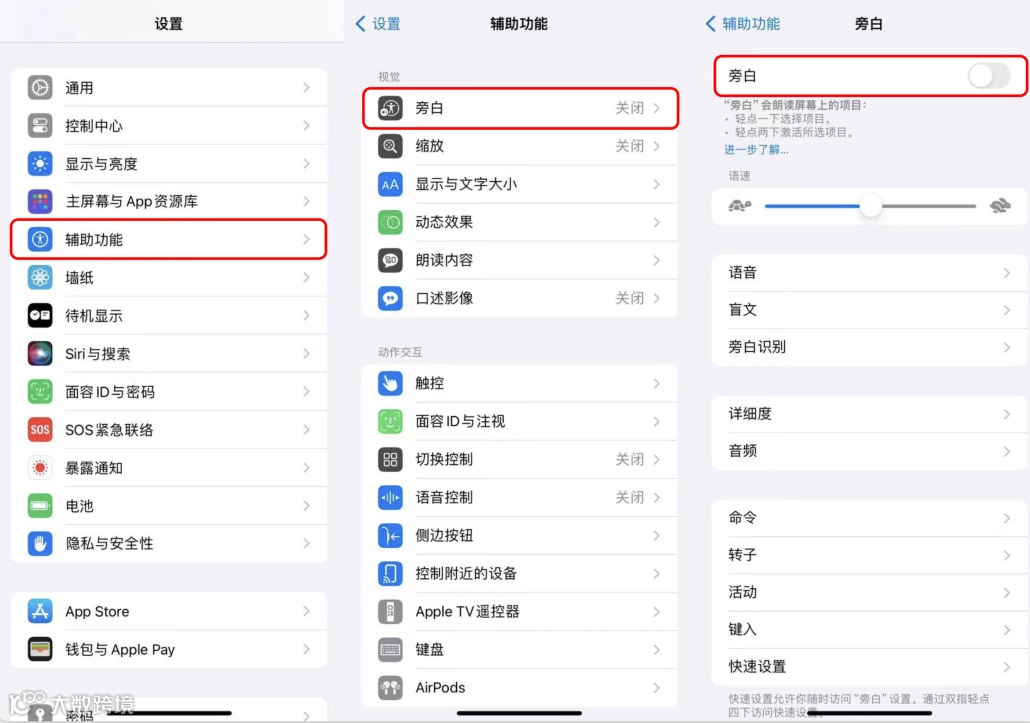 按照支付宝的说法,视障用户可以在亲友的帮助下,打开手机的「旁白」功能,以便使用这些新功能。iPhone 用户可以进入“设置”—“辅助功能”—“旁白”中打开旁白功能。