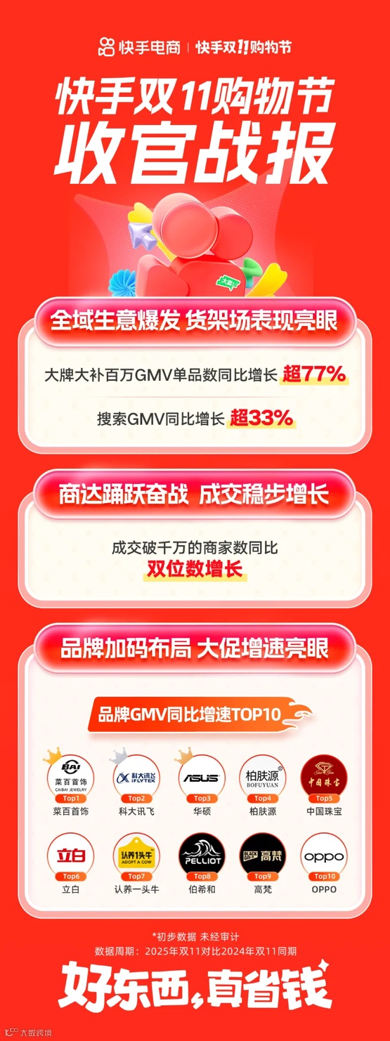 2025年双11大促收官战报震撼出炉!当行业还在为增速放缓发愁时,快手电商交出了一份令人惊叹的成绩单——泛货架电商GMV实现1650亿元,较去年同期劲增45%。更令人瞩目的是,这一成绩是在快手Q3泛货架GMV已达3240亿元(同比增长45.2%)的高基数上实现的,相当于每天为平台贡献超18亿元交易额。