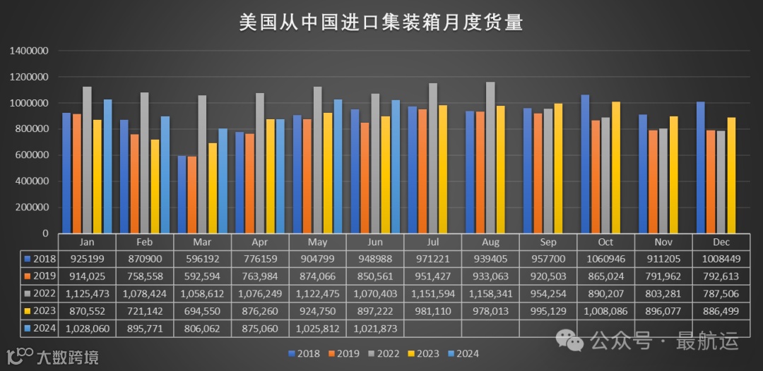 2/ 2024年6月美国从中国大陆进口集装箱的货量继续超100万标准箱!同比去年6月增长13.89%,同比2019年6月增长20.14%,同比2018年6月增长7.68%,环比今年5月微降0.38%。