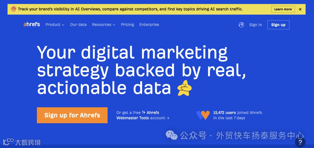 Ahrefs:以反向链接分析见长,同时涵盖关键词研究、内容优化与竞品分析模块,适合深度SEO运营,起价为每月129美元[k]。