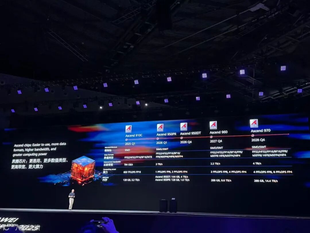 根据现场公布的信息,昇腾950PR芯片架构新增支持低精度数据格式,其中FP8/MXFP8/HIF8: 1 PFLOPS,MXFP4: 2 PFLOPS,重点提升向量算力,提升互联宽带2.5倍,支持华为自研HBM高带宽内存,分为HiBL 1.0和HiZQ 2.0两个版本。规格方面,HiBL 1.0容量128GB,带宽1.6TB/s;HiZQ 2.0容量144GB,带宽4TB/s。