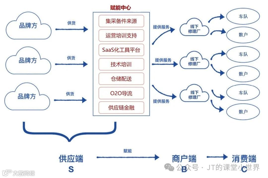 因此一旦有了平台,接下来就可以凭借线下有规模优势的修理厂来开发上游的供货资源,这样就把上游供应端和下游服务端的链条都能打通串联起来,从战略的角度来看,可以在利润结构上实现突破和多元发展了。这个就是典型的S2B2b2C的轻重结合模式(如视频号中的麦当劳模式介绍)。