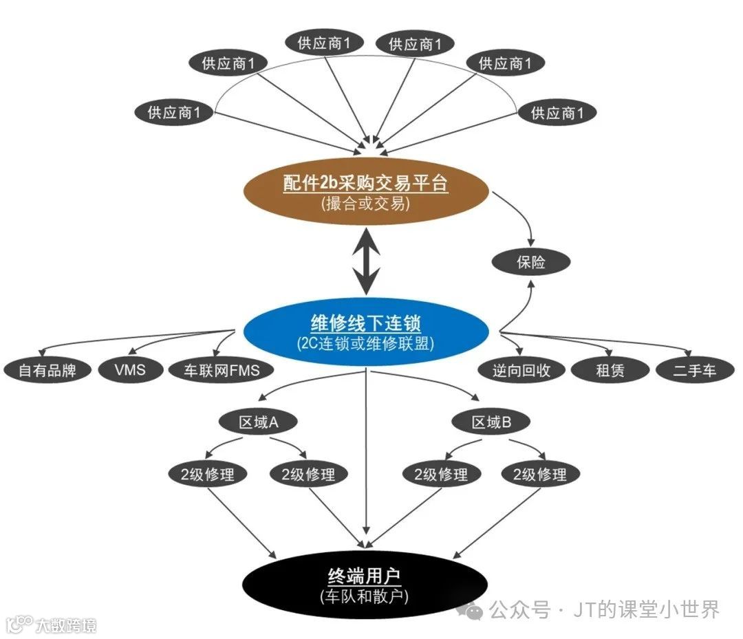 最后,我们来尝试把这些机会都简化,把最核心的也是最理想的一套模式提炼出来,就如下图所示。这套模式是相对终极的模式2B和2C的融合,实质是修配的融合,当然不一定短期也不可能由一家企业做过来,其中包括两个核心,即供应链整合及分销网络,和线下服务连锁或联盟组网。链合上游,加下游辐射网络,可以无惧未来新能源车辆的冲击。
