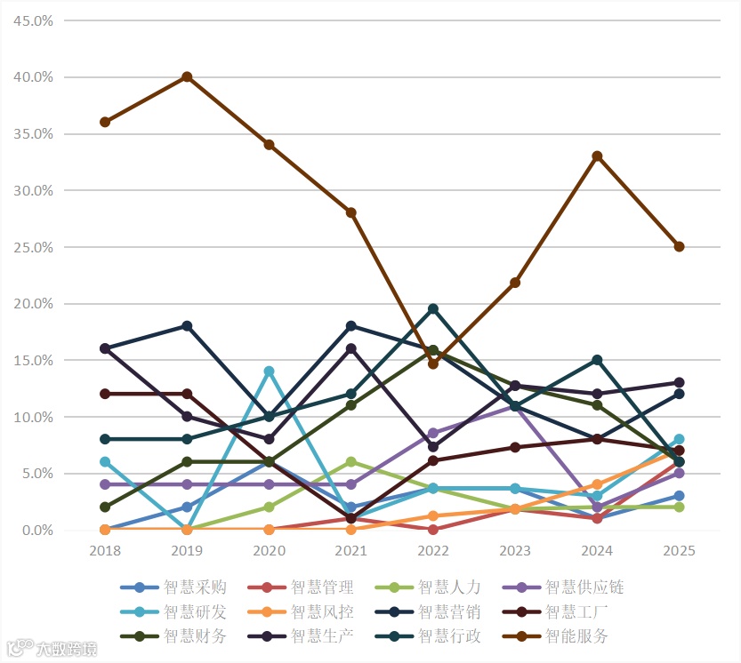 在场景应用上,智能服务场景在2019 年以 40.0% 的占比成为绝对头部,2025 年占比回落至 25.0%,但 2024 年仍保持 33.0% 的高占比。智慧风控、智慧研发、智慧供应链、智慧人力等场景占比普遍低于 10%,属于数智化渗透较浅的“长尾领域”。