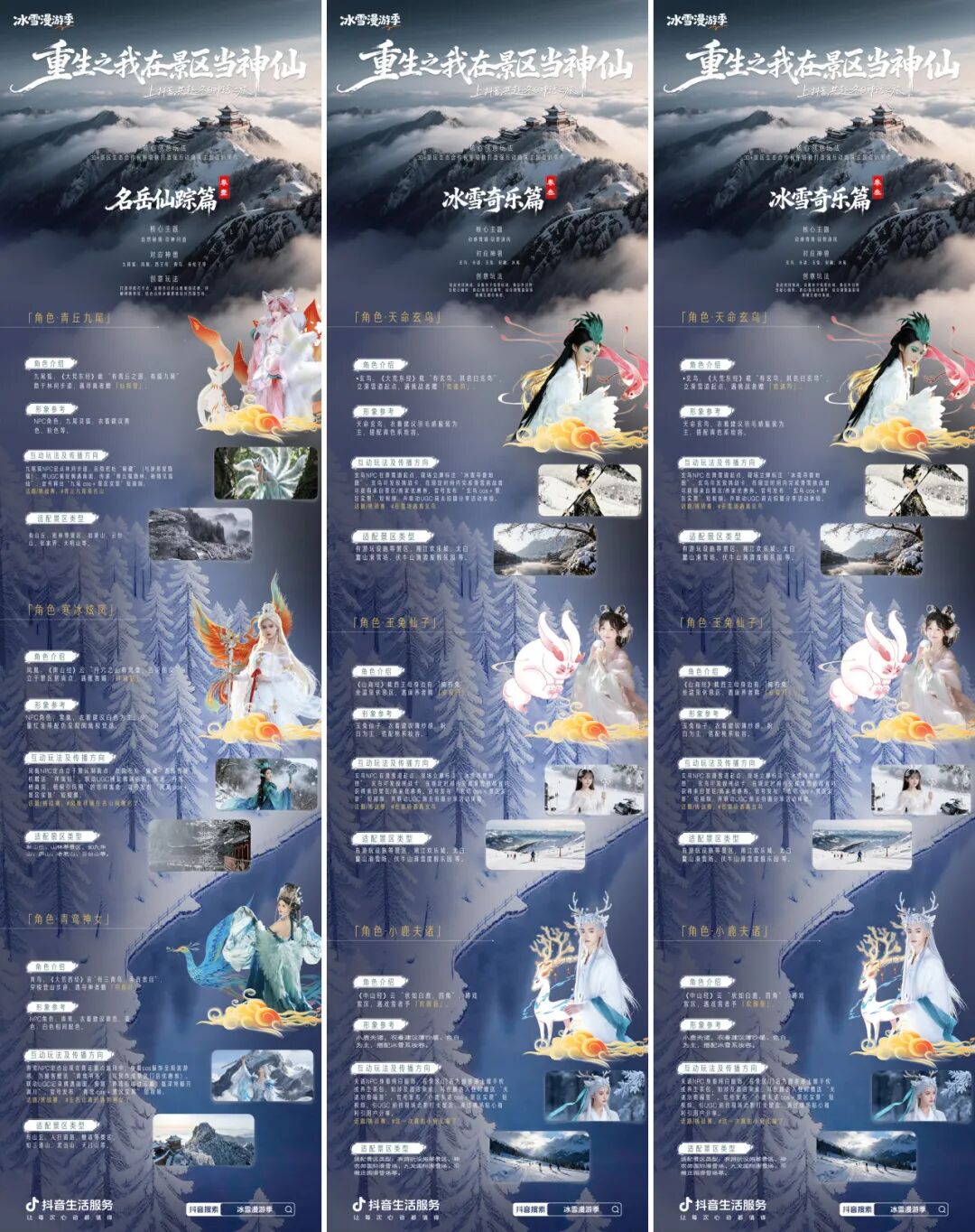 如果说明星是活动“开胃菜”,那么“山海经NPC现世”便是本次冰雪漫游季的核心“主菜”。此次活动与《山海经》IP深度绑定,根据山林、古镇、冰雪乐园等不同景区业态,匹配对应神兽NPC,打造“名岳仙踪”“古境奇遇”“冰雪奇乐”三大主题篇章。目前,如花、小崔一八八、姝洁等知名抖音cos类达人已确认加入,分别将空降“浙江横店影视城”、“罗蒙环球乐园”、“杭州宋城”等景区与大家亲密互动。