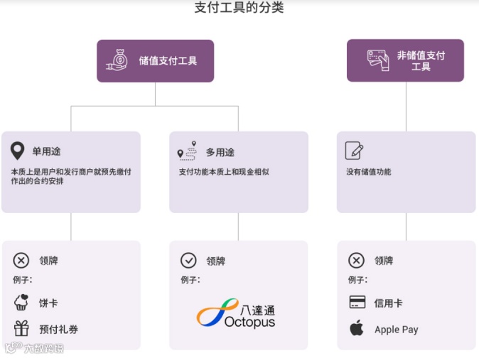 按用途划分,储值支付工具可以分为单用途、多用途及非储值支付工具。