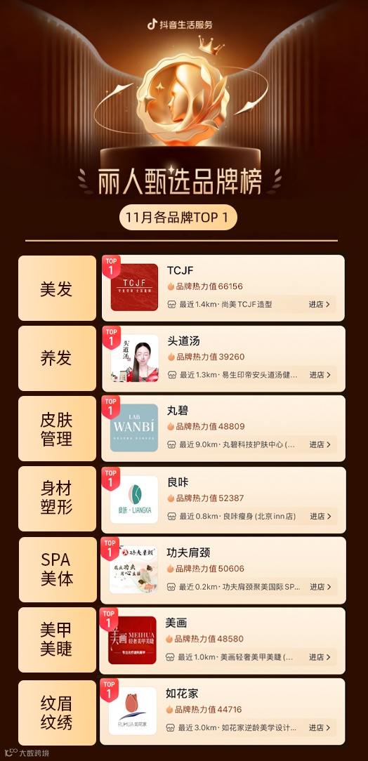 随着秋冬季节更替与节日场景临近,丽人消费市场迎来需求高峰,抖音生活服务 11 月丽人甄选品牌榜也更新迭代,七大品类消费呈现 “季节适配、场景细分、品质升级” 三大新趋势,藤野造型、头道汤、丸碧等优质品牌凭借精准定位持续稳定行业领先位置,而同步上线的年度「美丽榜」更浓缩全年行业精华,成为消费者与品牌的双向指引。