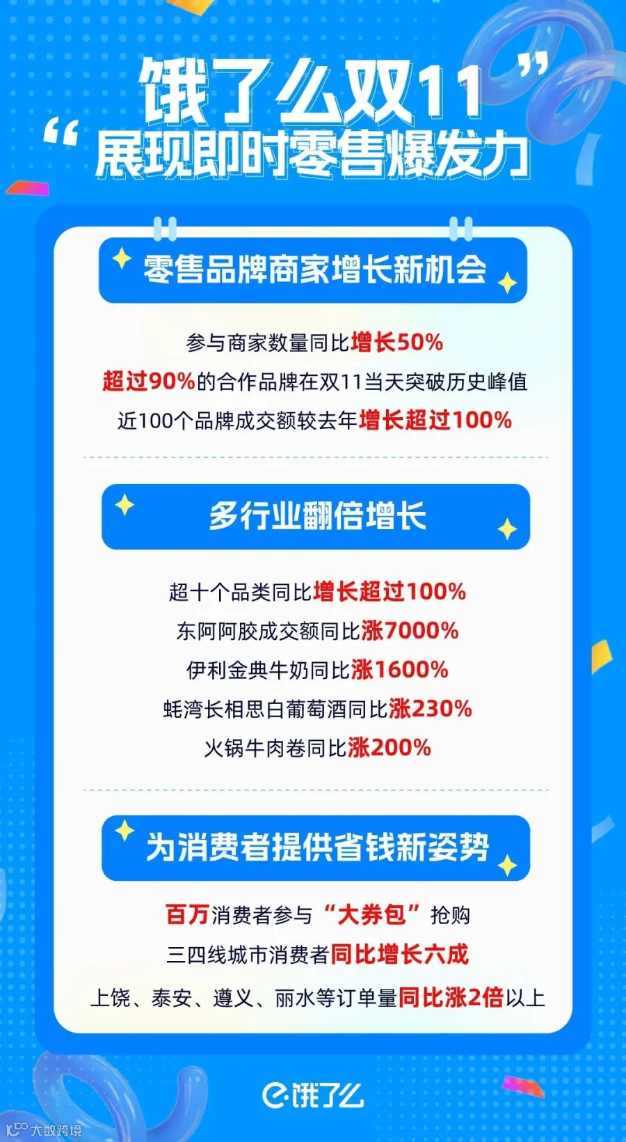 数据显示,今年饿了么双11成交、用户规模均创历史新高。其中,参与双11的商家数量同比去年增长50%,下单的三四线消费者同比增长六成。