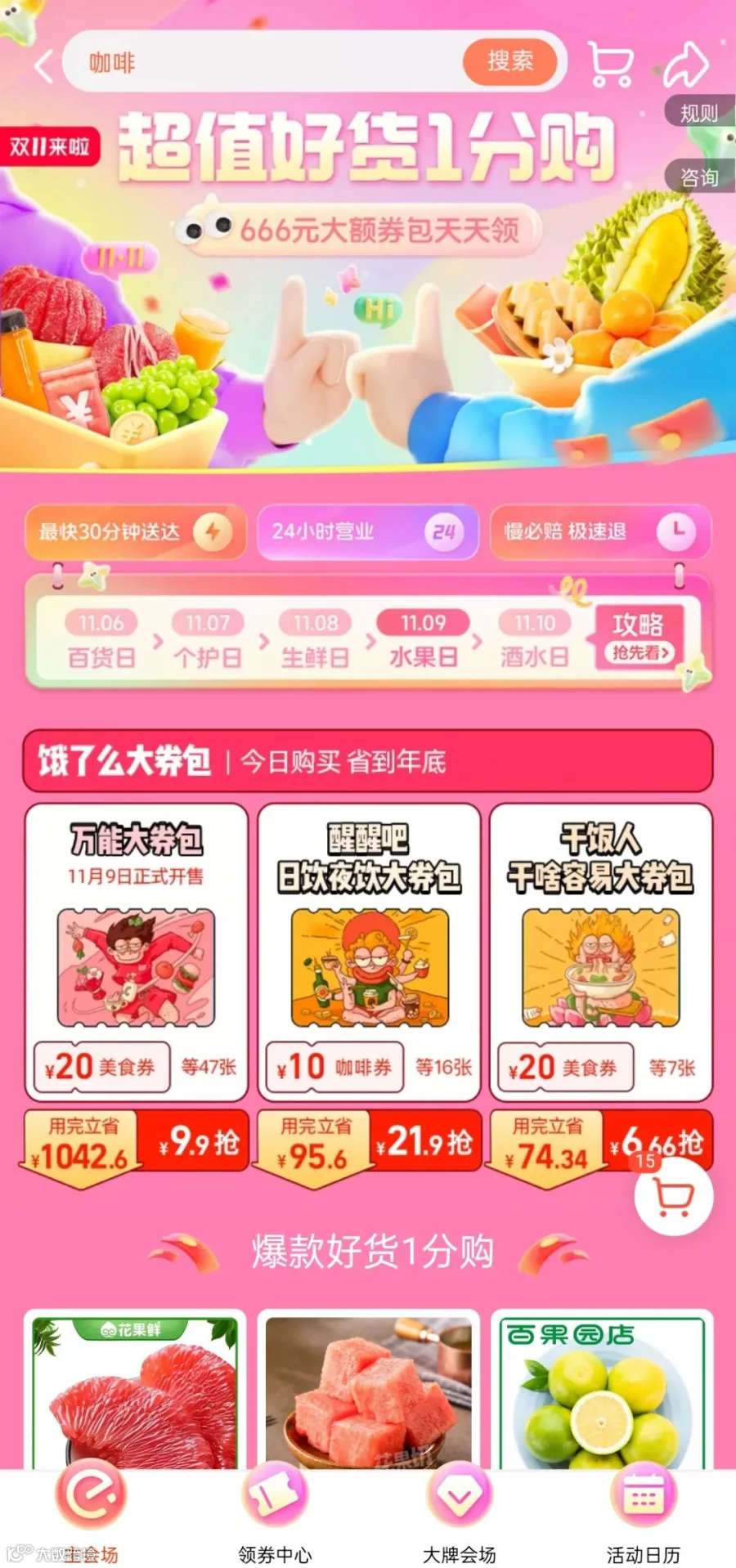 到了双11期间,饿了么的外卖和零售业务参与大促,并开始探索“囤券”等玩法。