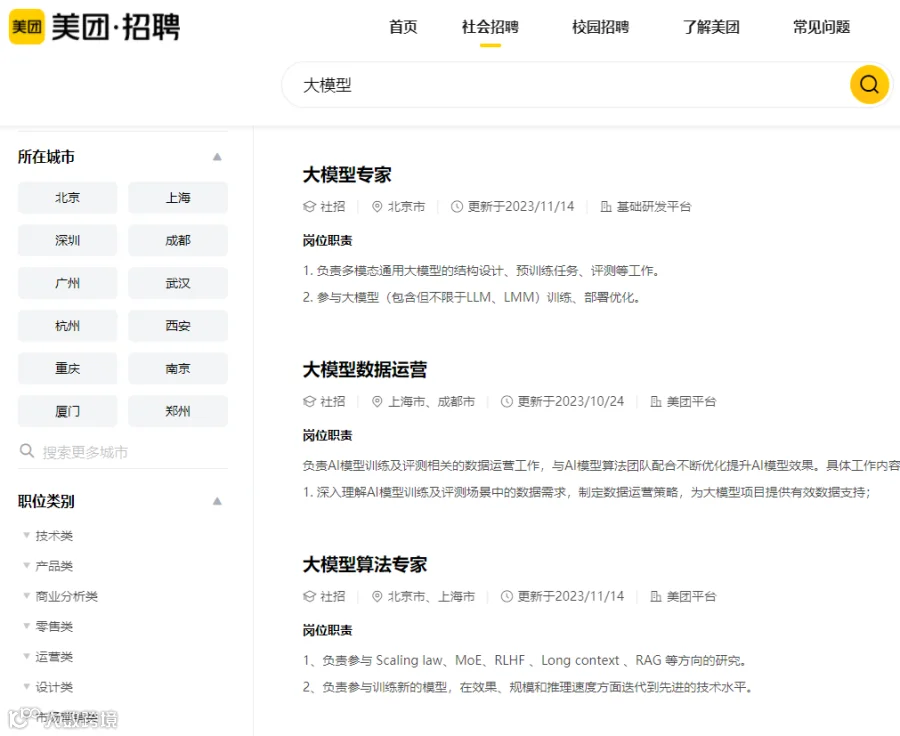 与此同时,美团还在扩大大模型技术人才的招募力度。美团招聘官网显示,有关大模型的相关职位覆盖了到店事业群、美团平台、基础研发平台、点评事业部、金融服务平台等多个部门,未来AI技术有望应用到外卖、配送等方面。