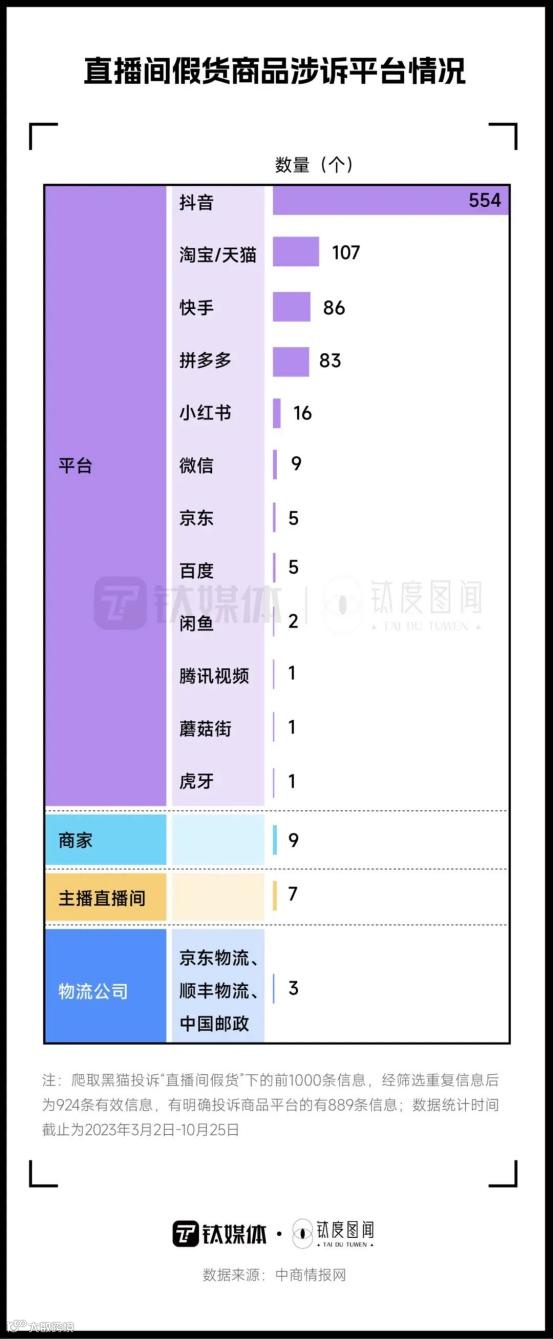 这些问题并非少见。据钛媒体报道,从3月2日至10月25日,前1000条投诉信息中,“玉石珠宝及首饰”是直播间假货遭投诉最多的产品,占比达23%。其次,美妆护肤品和衣帽的投诉排名也位列第二、第三。从平台方面看,抖音是直播假货投诉最多的平台,淘宝/天猫、快手、拼多多、小红书等平台的假货问题也不少。