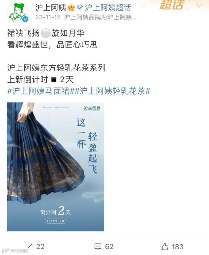 也有品牌巧借联名,试图用新中式元素点缀品牌形象。去年,马面裙一跃成为新中式爆款单品,沪上阿姨也乘着马面裙的东风,与相关品牌进行联名,为新品引流。