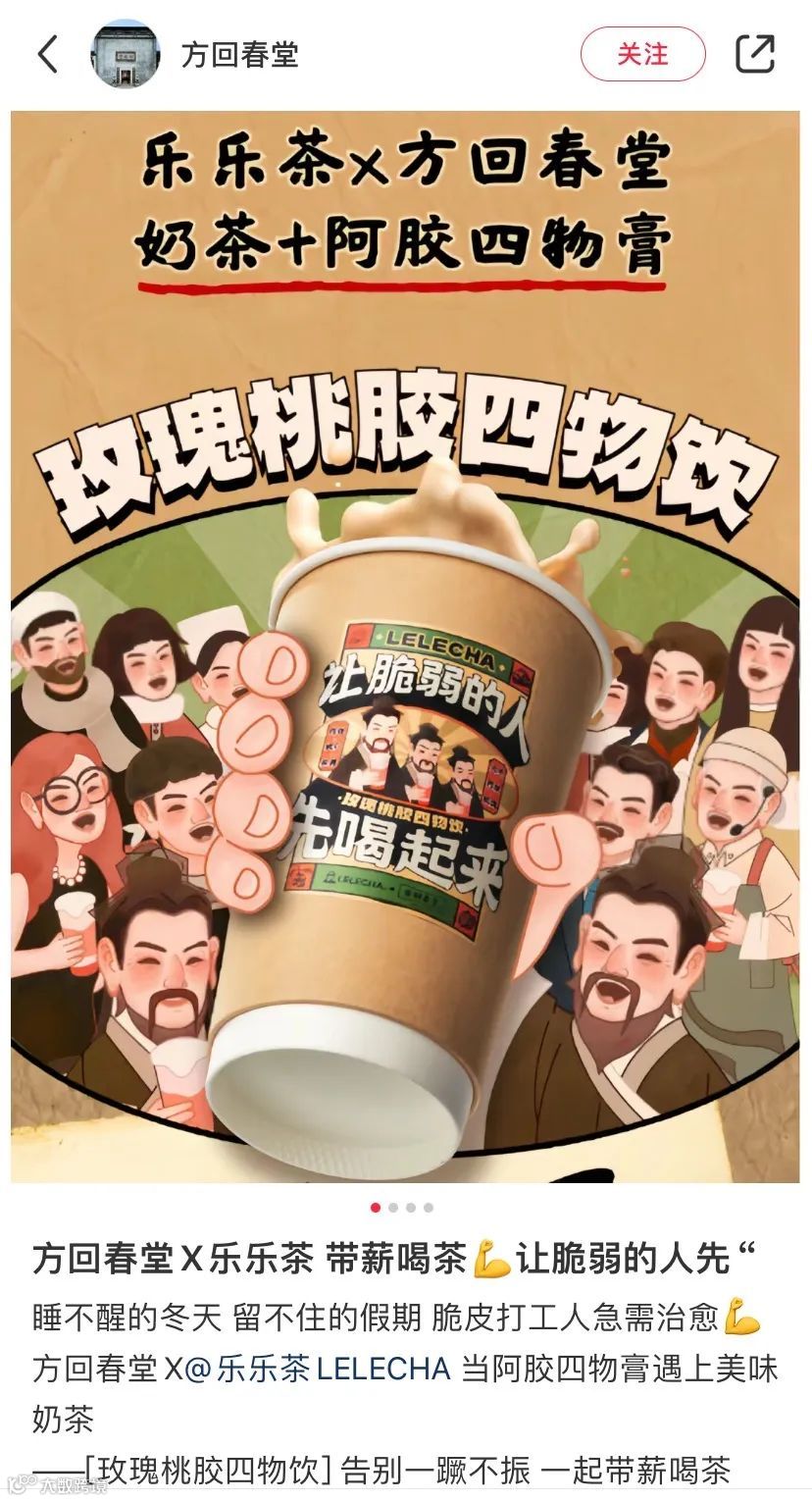 如果说喜茶是从年轻人的精神状态中博得共鸣,那么乐乐茶则是关注到了年轻群体的养生需求,吸引脆皮年轻人的关注。在年轻人愈发惜命的今天,乐乐茶与方回春堂合作,将中式养生思路与茶饮相融合,治愈脆皮打工人的精神面貌。