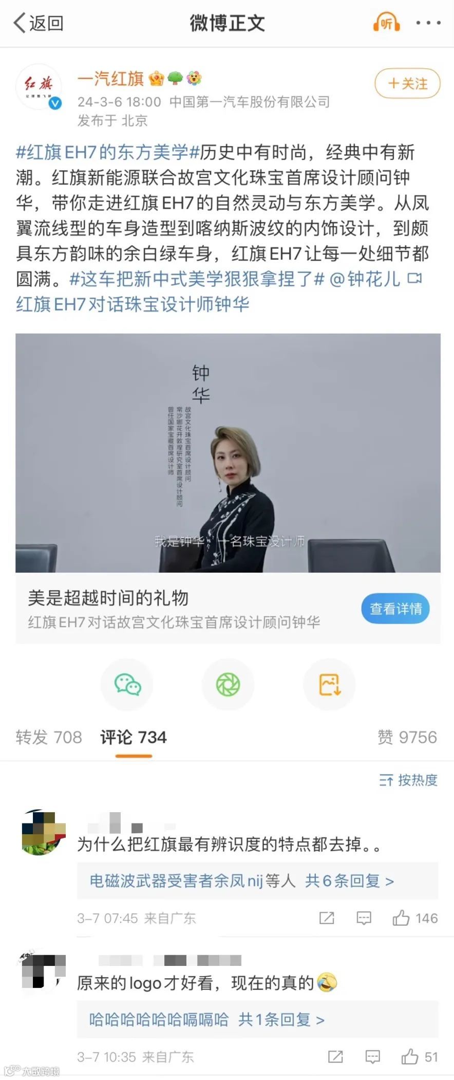 除被动玩起“中式恐怖”的理想MEGA外,也有车企开始以「新中式美学」为营销方向。为了给新车型预热,红旗一举将#这车把新中式美学狠狠拿捏住了#话题词条推上热搜。但是,释出的宣传物料却令不少红旗用户感叹,盲目追求新中式元素的红旗EH7已经失去了“最具辨识度的特点”。