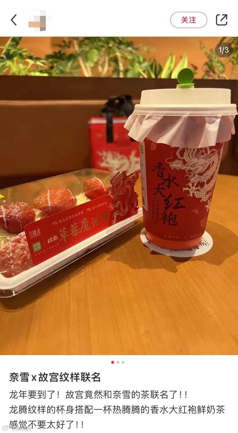 霸王茶姬以广东揭阳非遗“烟花火龙”为引,联动设计师品牌推出多款周边;奈雪携手《故宫纹样》以“升龙纹”“如意云纹”为核心元素,推出香火大花炮联名产品;眷茶与民间剪纸相碰撞,实现视觉创新。