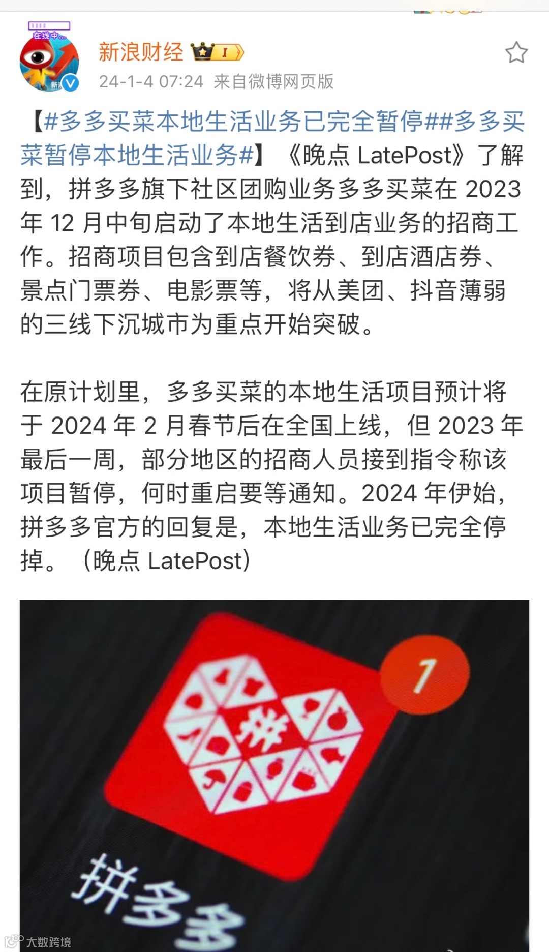 图源:截自微博按照原计划,多多买菜的本地生活项目将于今年2月春节后在全国上线。但在2023年最后一周,部分地区的招商人员接到指令称该项目暂停,何时重启要等通知。