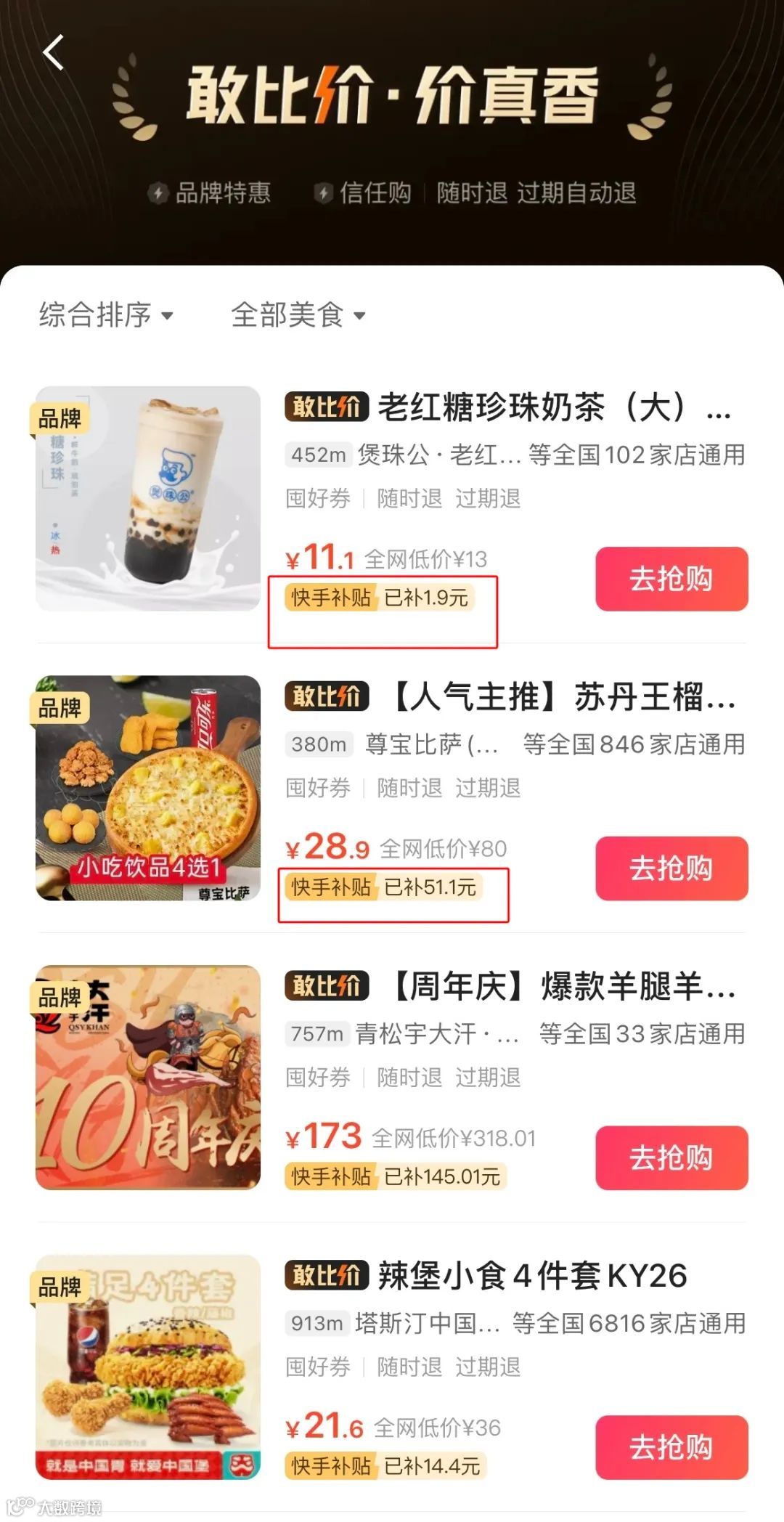 主编在快手团购频道观察到,当前快手团购频道内的大部分商品都有“快手补贴”几个字,价格也相对较低。