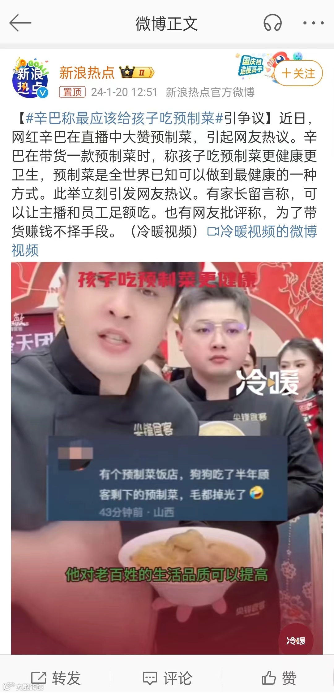 今年年初,辛巴关于最应该给孩子吃预制菜的观点就引发了热议。紧接着辛巴回应热搜,称自己是被断章取义,说的是让大家去吃好东西,不是让去吃垃圾坏东西,并表示老干妈、奶粉都是预制菜。