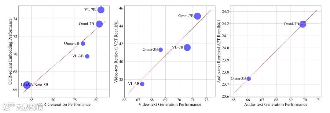 我们发现,MLLM的生成能力和其表征能力上限之间存在强烈的正相关关系 。我们先绘制了模型在OCR、视频转文本、音频转文本等生成任务上的分数(X轴)与经过对比学习后在表征任务上的分数(Y轴)的关系图 。