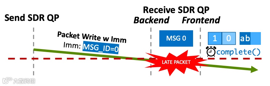 迟包保护机制:跨数据中心链路的迟包(Late Packet)可能篡改新消息的 Bitmap,SDR 通过两层保护解决。消息完成后,接收端内存键指向 “NULL 内存区”,迟包写入直接丢弃;引入消息代次(Generation)。每个 SDR 队列对(QP)分配多个内部 QP,每个 QP 对应一个代次,迟包的代次不匹配则被过滤。