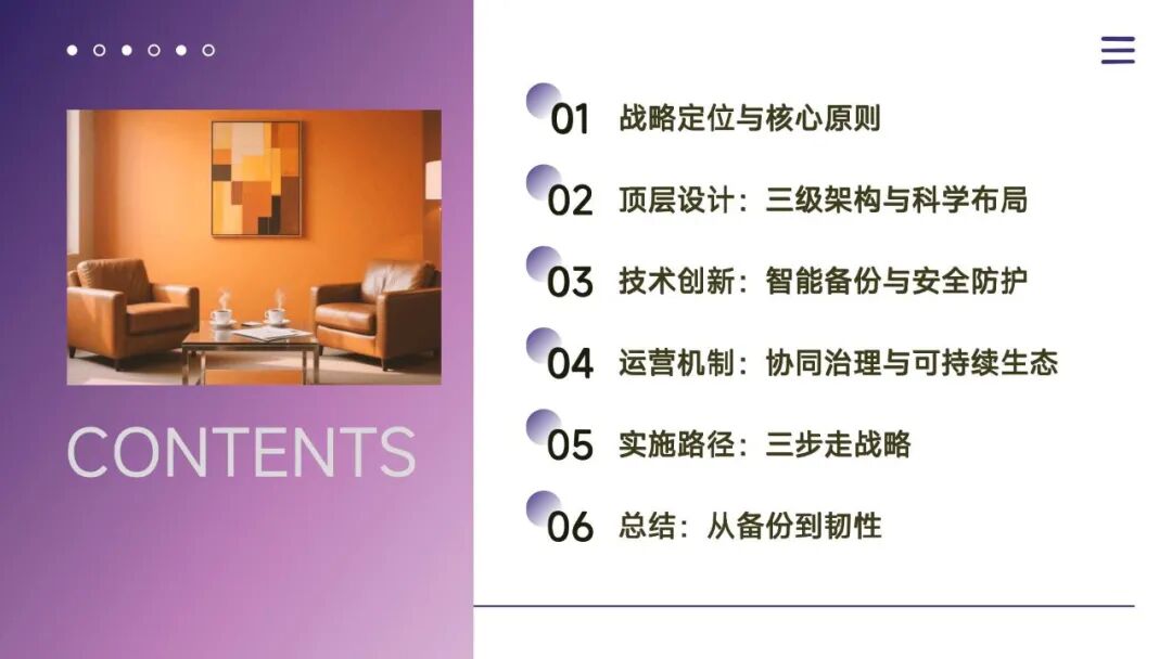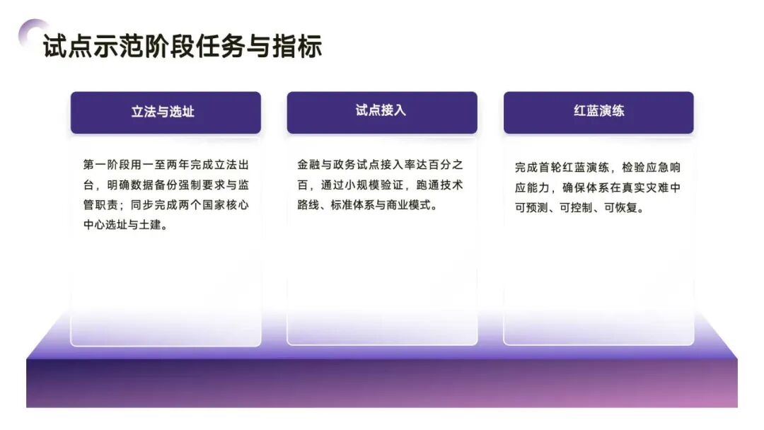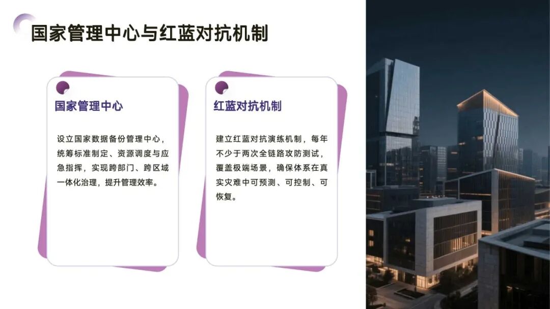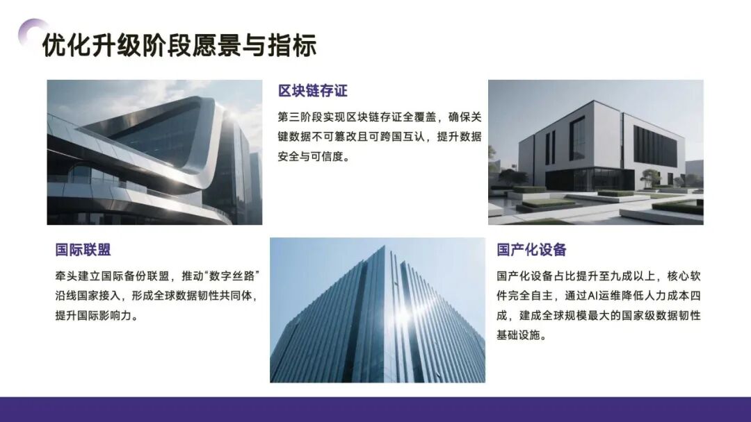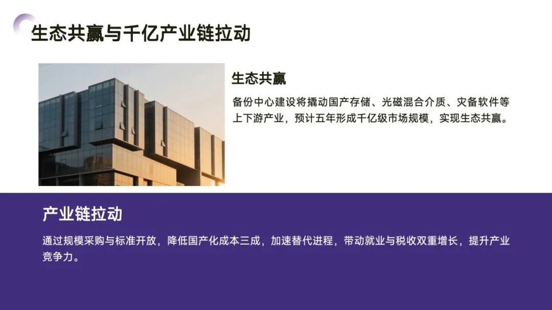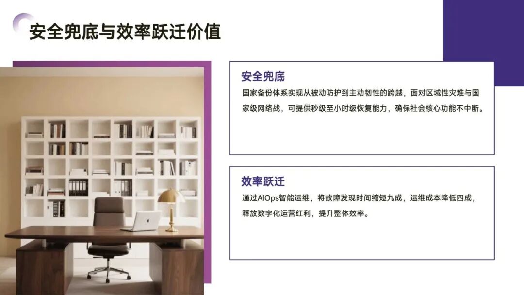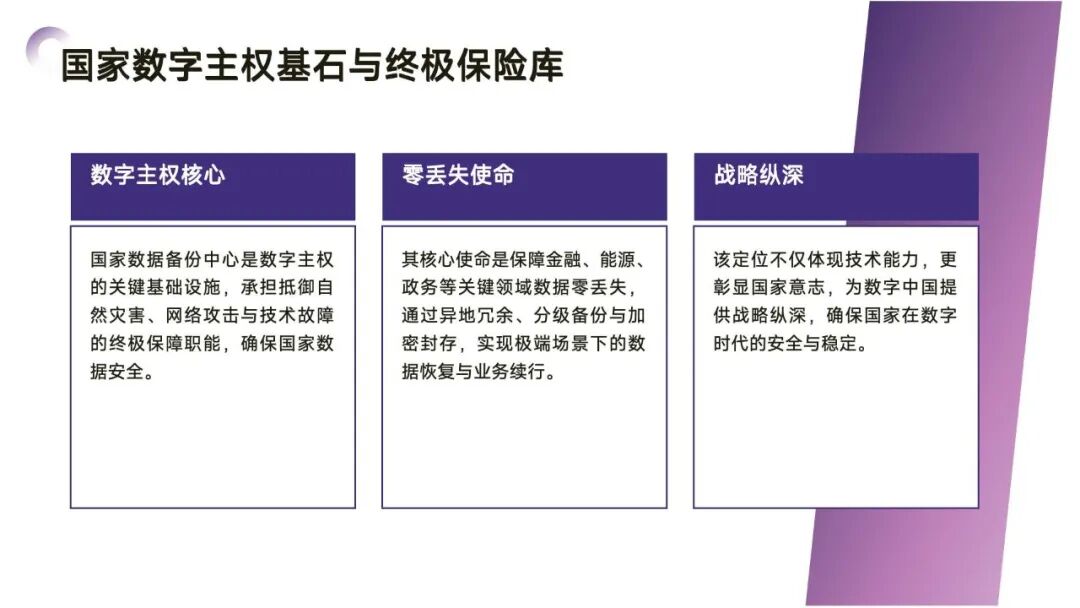 此方案规划了国家、区域、行业三级协同的架构,并融合了四级智能存储、零信任安全防护等关键技术。通过“平战结合”的运营机制和“三步走”的实施路径,该体系不仅致力于实现从被动备份到主动韧性的跨越,更期望以此拉动国产化产业链发展,最终为数字中国的建设筑牢安全底座。