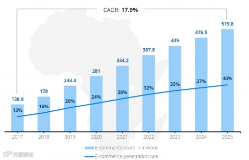 据TRADE数据显示,预计到 2025 年,非洲的电子商务用户将超过 5 亿,市场在线消费者的复合年增长率 (CAGR) 将稳定保持在 17%。
