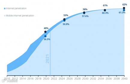 预计 2010 年至 2040 年非洲的移动互联网和互联网总体普及率