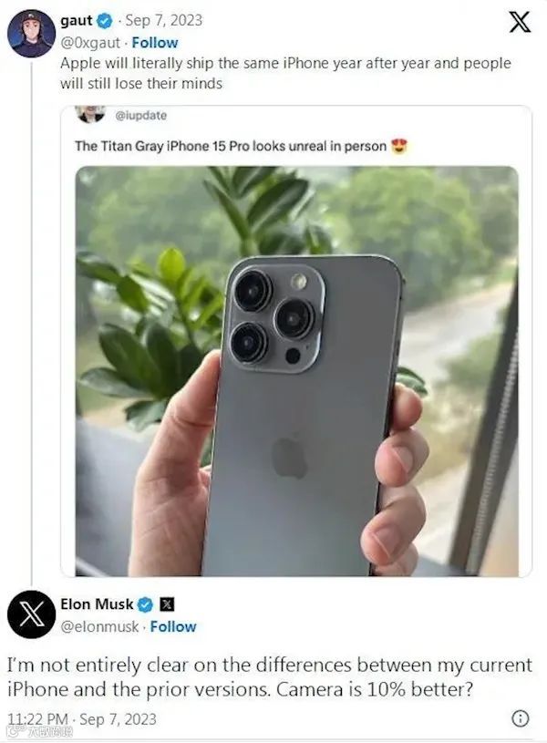 从目前已知消息来看,即将发布的 iPhone 15系列依然没有什么太大的创新,连“钢铁侠”马斯克都看不下去,吐槽iPhone 15换代毫无新意,此话也被很多网友表示认同。