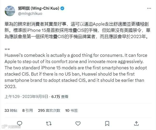 今天,知名分析师郭明錤也发文称,华为的归来对于消费者来说,其实是一件好事,这可以倒逼苹果走出舒适圈,并促进其积极创新。