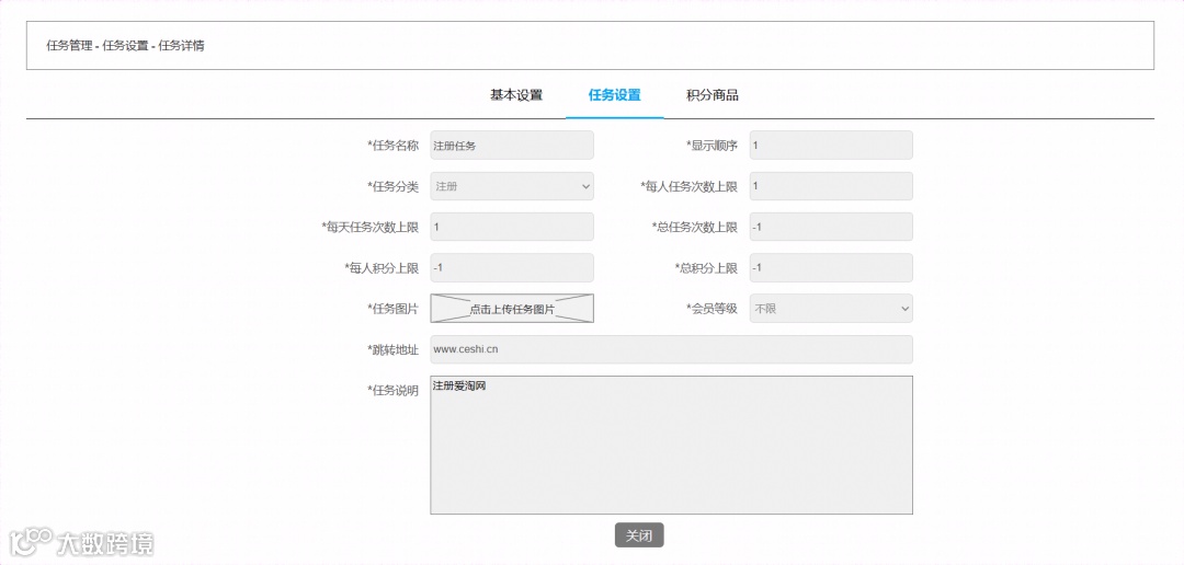 任务详情页面,显示内容:任务名称、显示顺序、任务分类、每人任务次数上限、每天任务上限、总任务上限、每人积分上限、总积分上限、任务图片、会员等级、跳转地址和任务说明; -