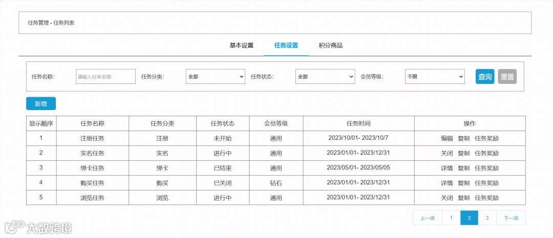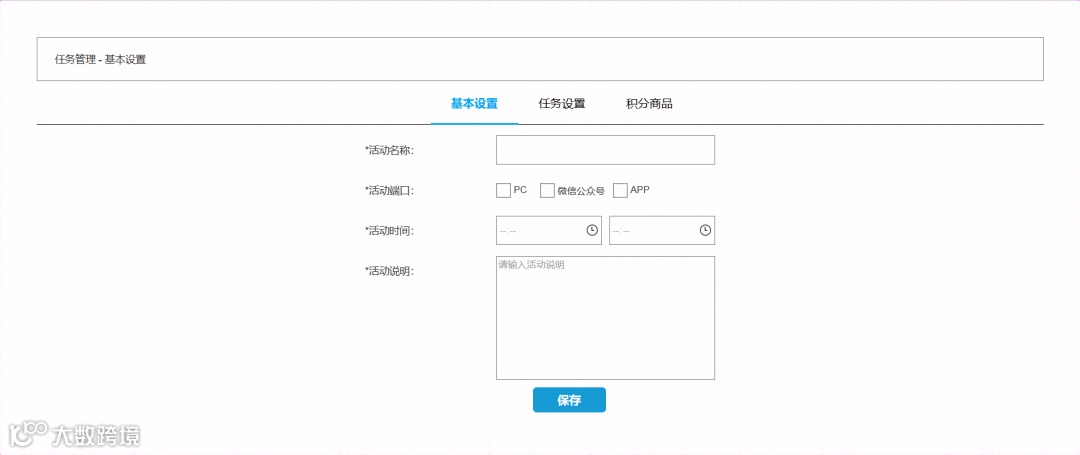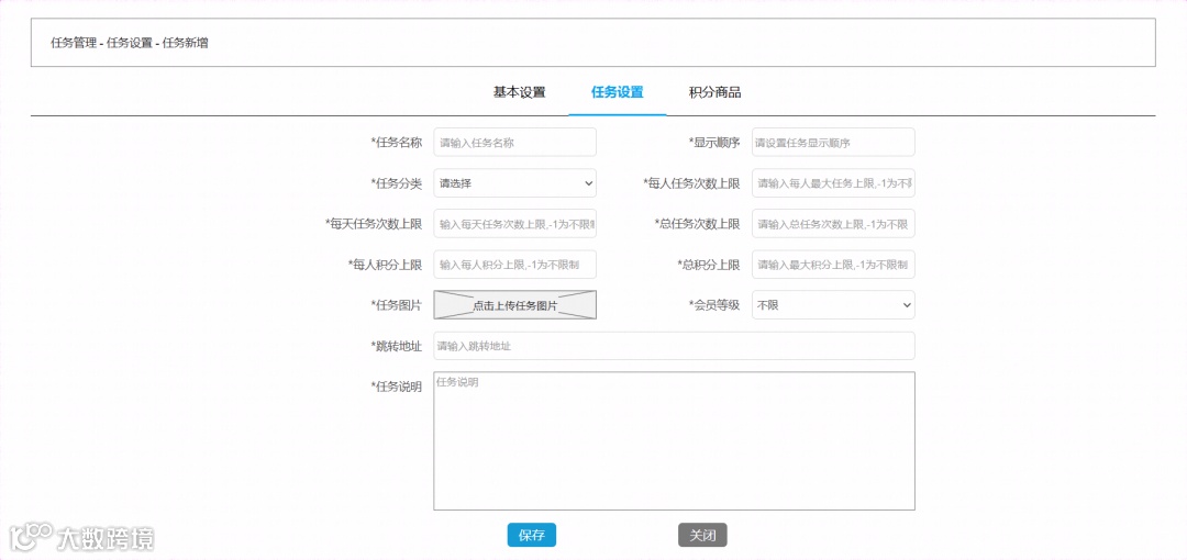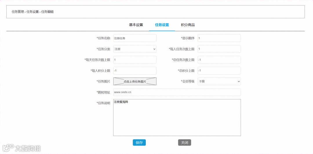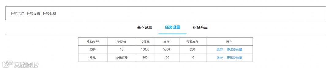 支持任务奖励的积分设置和奖品设置; -
