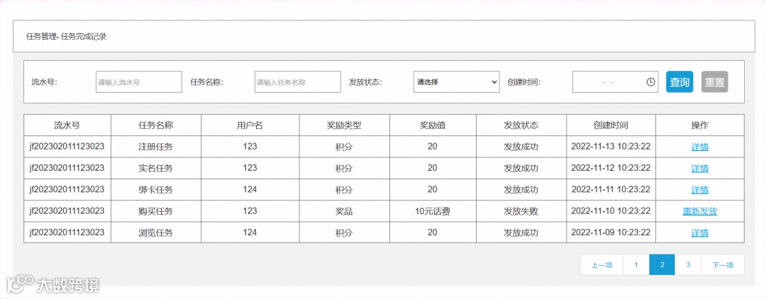 列表显示内容:流水号、任务名称、用户名、奖励类型、奖励值、发放状态和创建时间;