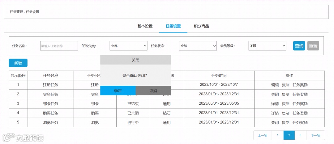 任务设置页面,点击【关闭】按钮,弹窗显示关闭页面; -
