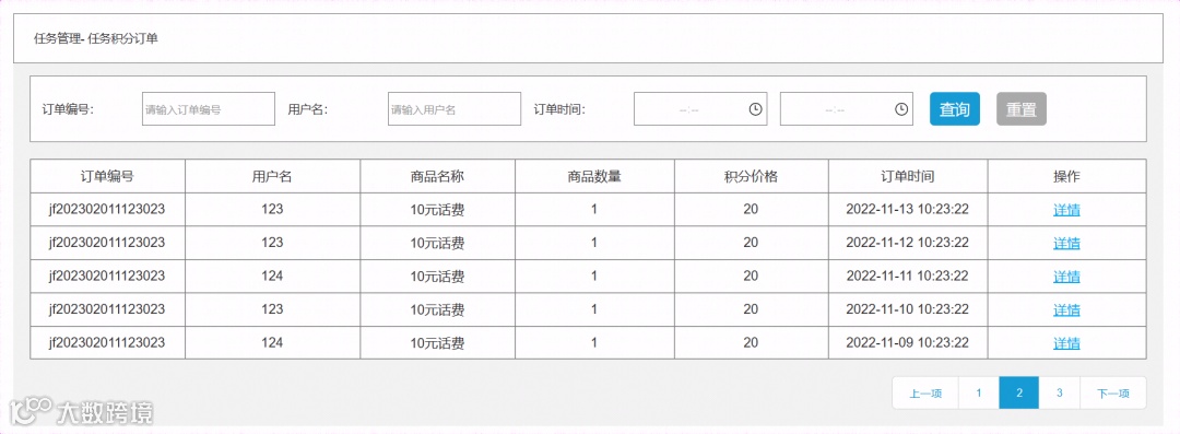 列表显示内容:订单编号、用户名、商品名称、商品数量、积分价格和订单时间; -