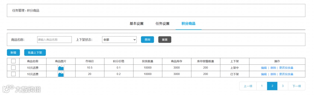 列表显示内容:商品名称、商品图片、市场价、积分价格、投放数量、商品库存、库存预警状态和上下架; -