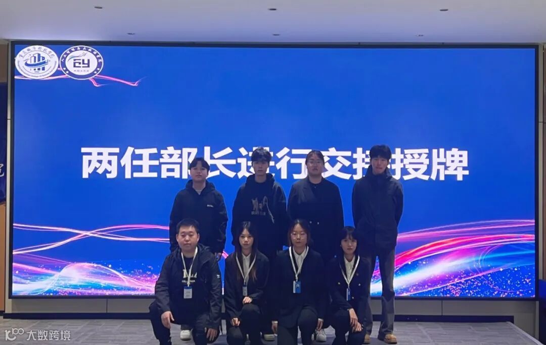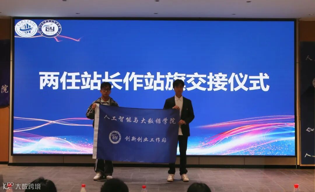 表彰环节落幕后,大会进入换届核心流程。双创工作站指导老师谢亚菊老师宣读《第五届双创工作站干部任命名单》,明确了新一届团队的组织架构。随后,两任工作站站长完成站旗交接仪式,标志着双创工作的接力棒正式交接。第四届工作站干部也为第五届干部进行授牌,每一枚工作牌的佩戴,都承载着“薪火相传”的期待。
