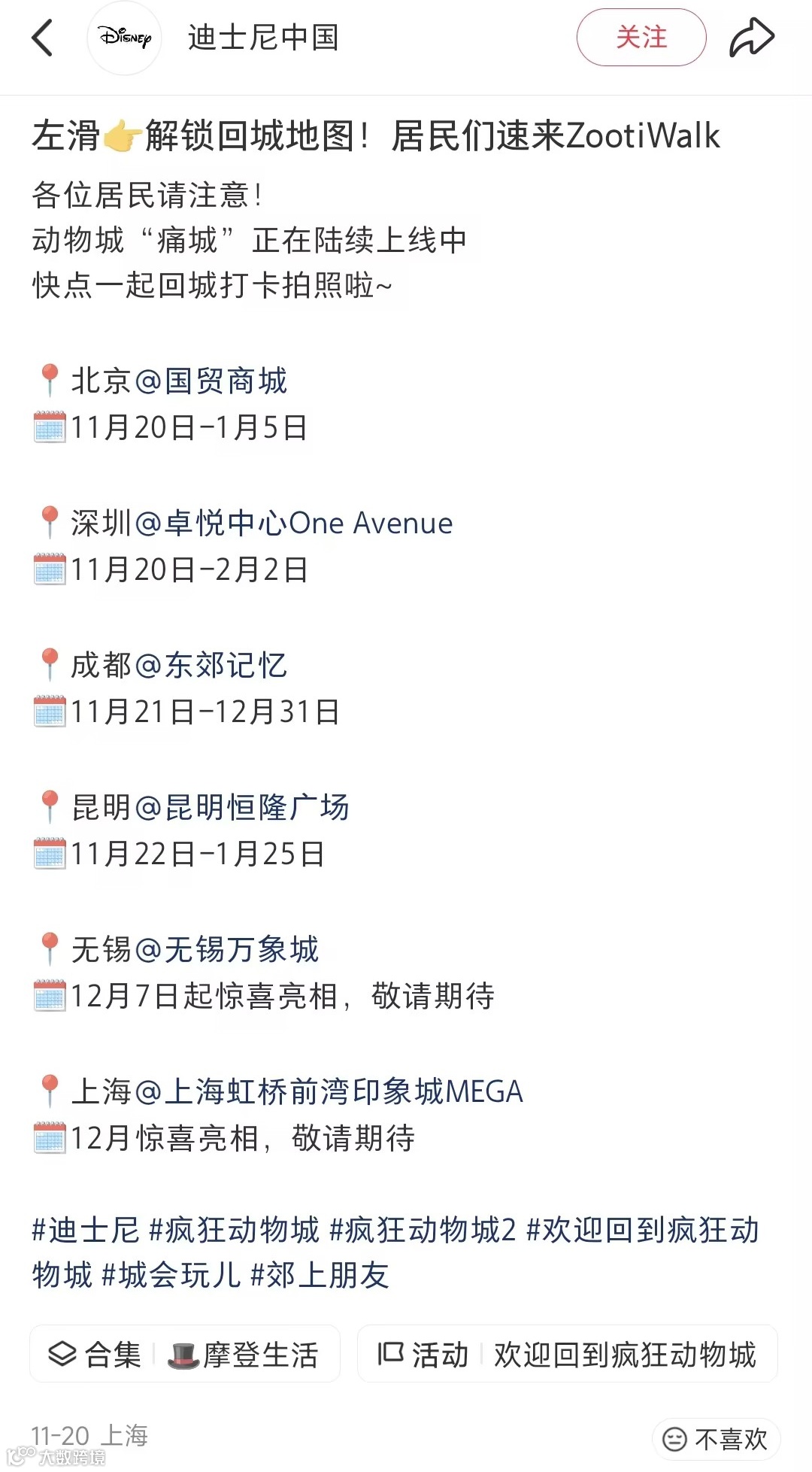 除了上海的主题园区,全国各地还有众多与《疯狂动物城2》相关的打卡等你探索:“痛城”将陆续在北京、深圳、程度、无锡、上海、昆明 各大商圈上线~